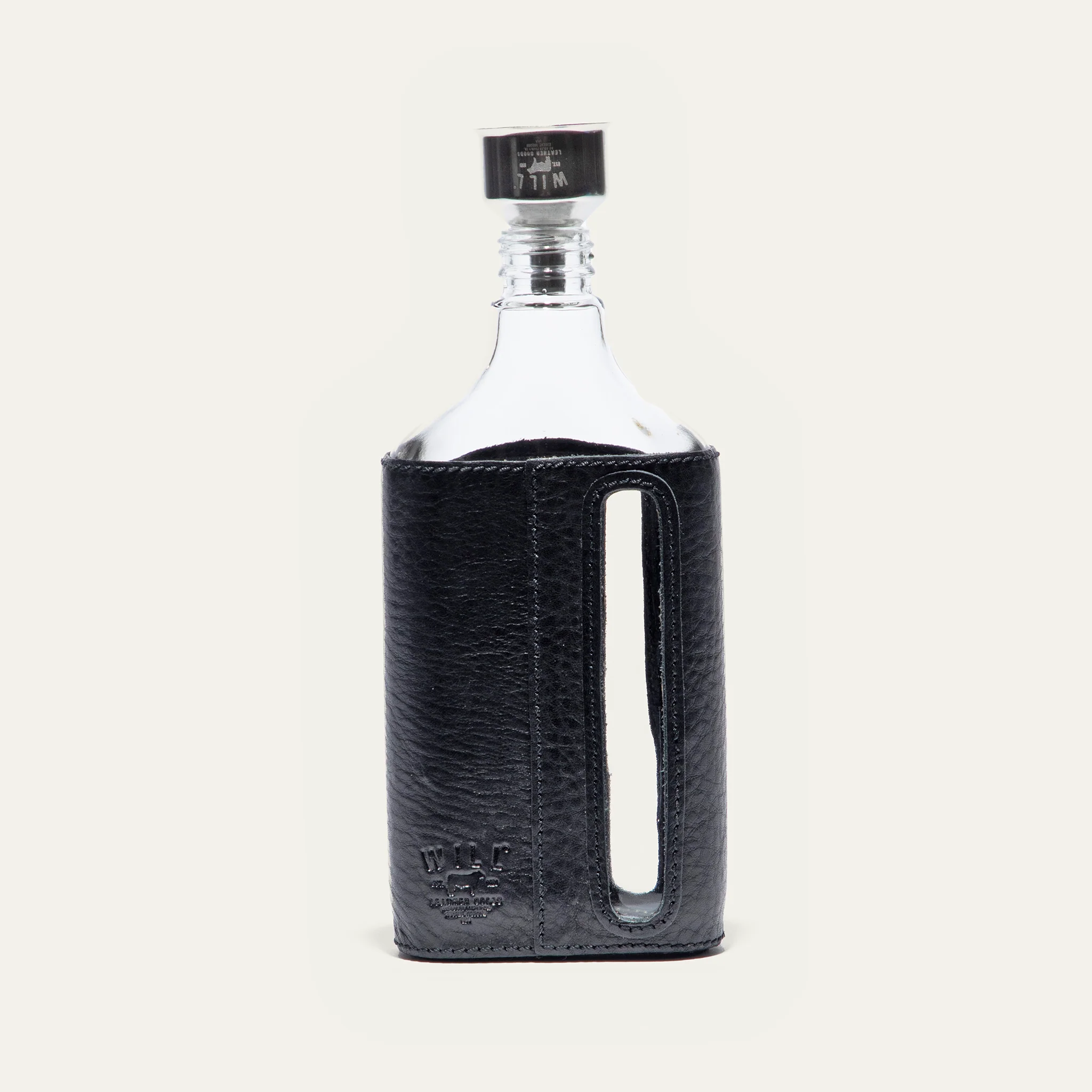 Our 375ml Leather and Glass Flask is wrapped in full-grain, vegetable-tanned leather. Featuring vertical pour windows on each side and a molded leather panel at the base for added stability. Topped with a stainless steel screw-on lid for secure closure and includes a stainless steel funnel for easy filling. Built for a lifetime of libations, our Leather and Glass Flask is built to last. We stand behind our product—guaranteed for life.Â
