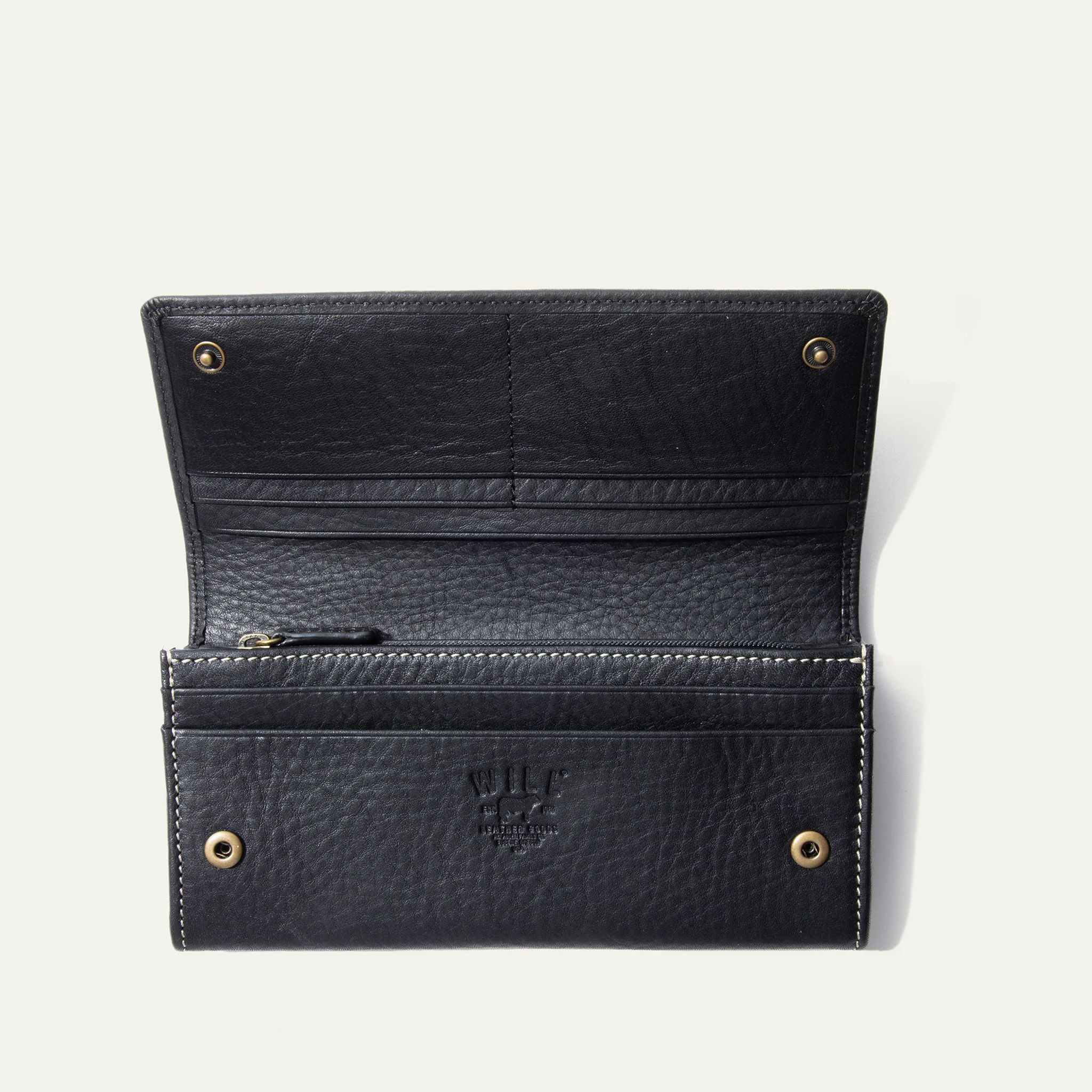 The Haircalf Classic Continental Wallet is handcrafted from full-grain vegetable-tanned leather and haircalf. Featuring copious amounts of organizational options, including 12 credit card slots, a dedicated ID window, two bill sleeves, a central brass YKK-zippered pocket, and two compartments for additional items. Dual steel-molded pin snaps secure the closure of our Classic Continental wallet. We stand behind our product—guaranteed for life.
